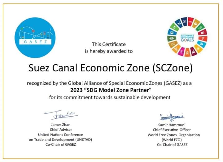 حصلت المنطقة الاقتصادية لقناة السويس على شهادة شراكة نموذج أهداف التنمية المستدامة للمناطق الاقتصادية “SDG Model Zone Partner” من التحالف العالمي للمناطق الاقتصادية الخاصة Global Alliance of Special Economic Zones “GASEZ”، وقد تم الإعلان عن هذا التصنيف خلال منتدى الاستثمار العالمي لمؤتمر الأمم المتحدة للتجارة والتنمية The United Nations Conference on Trade and Development “UNCTAD”، الذي أقيم بدولة الإمارات العربية المتحدة في أكتوبر 2023، والمؤتمر الثاني للتحالف العالمي للمناطق الاقتصادية الخاصة “GASEZ” الذي أقيم بمدينة برشلونة بإسبانيا في 9 نوفمبر 2023.