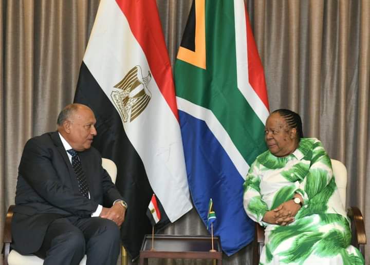 وذكر المتحدث الرسمي ، أن وزير الخارجية أكد على تطلع مصر للقيام بدور فاعل ومؤثر داخل تجمع البريكس والتعاون عن قرب مع جنوب أفريقيا من أجل الاسهام في جهود التجمع الرامية إلى إيجاد حلول عملية قابلة للتنفيذ لمواجهة التحديات التي تعاني منها دولنا والتي تتطلب تكثيف العمل المشترك في إطار التعاون الجنوب – جنوب، فضلاً عن التنسيق سوياً لتعزيز قدرة التجمع على التعبير عن رؤى دول الجنوب لجعل مؤسسات الحوكمة الاقتصادية العالمية أكثر استجابةً لتطلعات وتحديات الدول النامية. كما اتفق الوزيران على أهمية العمل سوياً للتعبير عن أولويات الدول النامية، وخاصة الافريقية منها في مجموعة العشرين، مشيرين إلى أهمية تعامل مجموعة العشرين بشكل عاجل وفعال لمعالجة أزمة الديون، والتي طالت أكثر من ٣٧ دولة منها ٢١ دولة أفريقية.