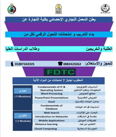 تحت رعاية الدكتور أحمد المنشاوي رئيس جامعة أسيوط؛ تعلن كلية التجارة عن بدء التدريب وامتحانات التحول الرقمي بالمعمل التجاري الإحصائي؛ للطلاب والخريجين، وطلاب الدراسات العليا؛ وذلك تحت إشراف الدكتور محمود عبد العليم نائب رئيس الجامعة لشئون خدمة المجتمع وتنمية البيئة، والدكتور علاء عبد الحفيظ عميد الكلية، والدكتور أمل الدالي وكيل الكلية لشئون خدمة المجتمع وتنمية البيئة.