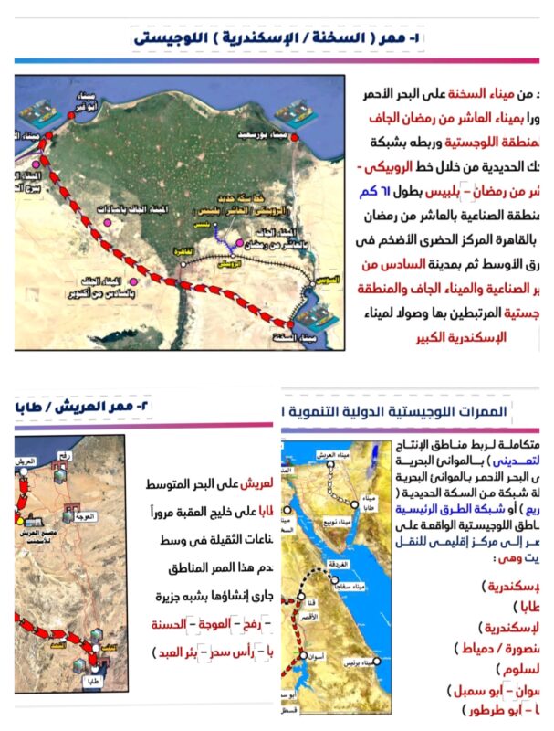 وتتمثل هذه الممرات اللوجستية المتكاملة في ممر السـخنة – الإسكندرية اللوجيستي والذي يمتد من ميناء السخنة علي البحر الأحمر مروراً بميناء العاشر من رمضان الجاف والمنطقة اللوجستية وربطه بشبكة السكك الحديدية من خلال خط الروبيكي – العاشر من رمضان – بلبيس بطول 63,5 كم والمنطقة الصناعية بالعاشر من رمضان مرورا بالقاهرة المركز الحضري الأضخم في الشرق الأوسط ثم بمدينة السادس من أكتوبر الصناعية والميناء الجاف والمنطقة اللوجستية وصولا لميناء الإسكندرية الكبير، وممر العريش – طابا اللوجيستي الذي يبدأ من ميناء العريش علي البحر المتوسط وحتي ميناء طابا علي خليج العقبة مروراً بمناطق الصناعات الثقيلة في وسط سيناء ويخدم هذا الممر المناطق اللوجستية الجاري إنشاؤها بشبه جزيرة سيناء ( الطور – رفح – العوجة – الحسنة – النقب – طابا – رأس سدر – بئر العبد)