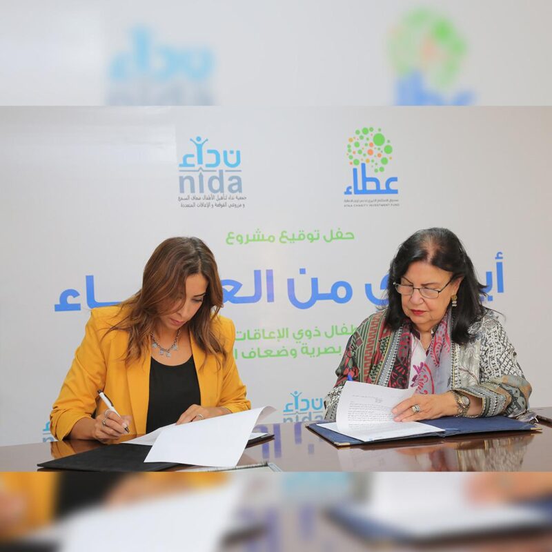 في إطار اليوم العالمي للأشخاص ذوي الإعاقة وقعت أميرة الرفاعي المدير التنفيذي لصندوق الاستثمار الخيري لدعم ذوي الإعاقة ” عطاء” وماجدة أحمد فهمي رئيس مجلس إدارة جمعية نداء عقدا لدعم مشروع “أيادي من العطاء”.