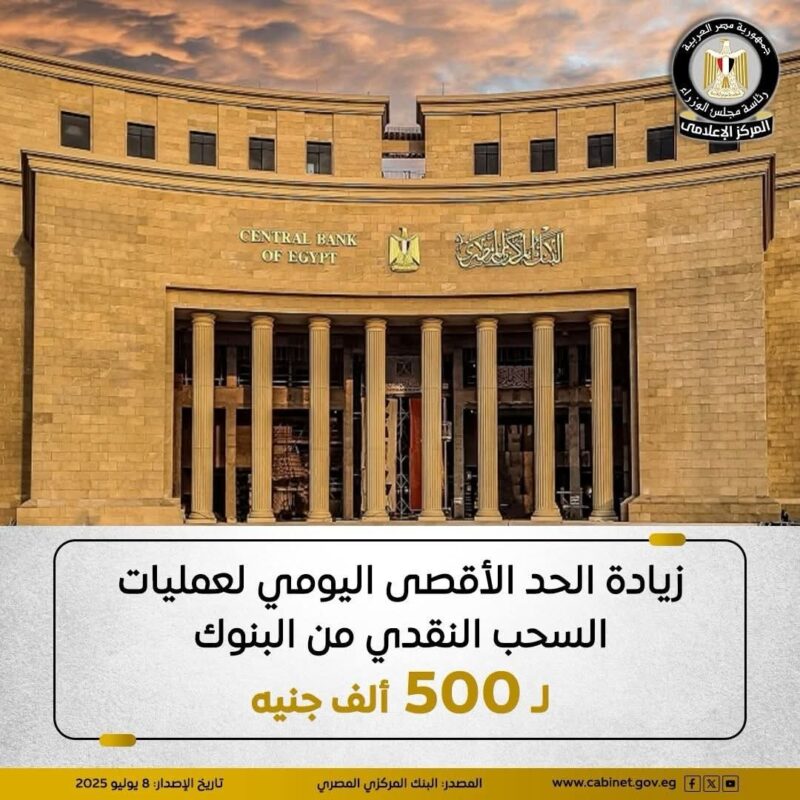 في إطار حرص البنك المركزي المصري على توفير الخدمات البنكية المقدمة للجمهور على أكمل وجه، فقد تقرر السماح بمد مواعيد العمل ببعض فروع البنوك لخدمة الجمهور، وفقًا للتوزيع الجغرافي للفروع على مستوى الجمهورية بناء على رؤية كل بنك، وذلك حتى الساعة الخامسة مساءً، بدلًا من الساعة الثالثة عصرًا، وذلك خلال أيام العمل الرسمية (من الأحد إلى الخميس) اعتبارًا من اليوم الثلاثاء الموافق 8 يوليو 2025، لحين صدور تعليمات أخرى.