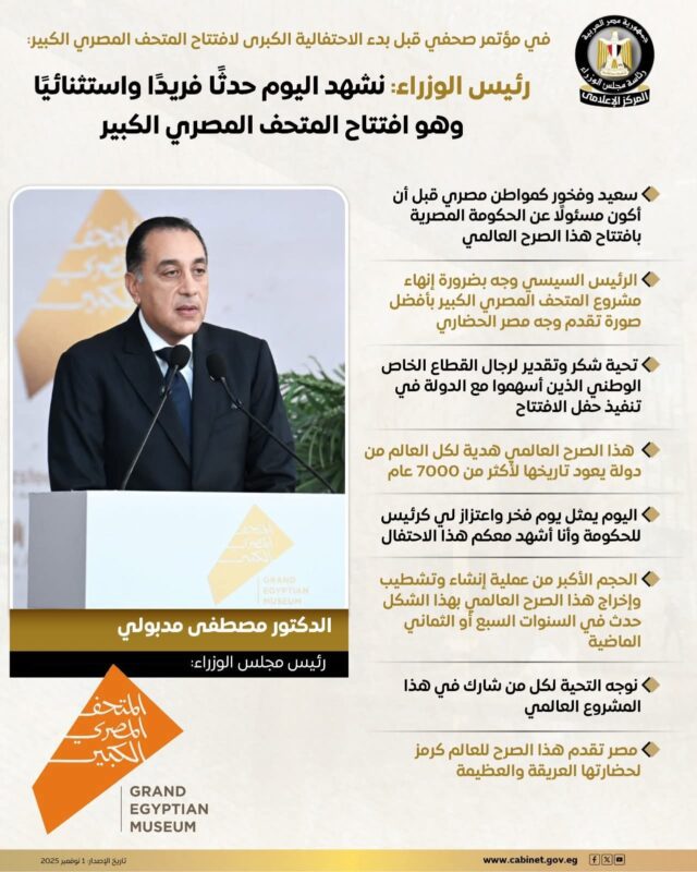 في مؤتمر صحفي قبل بدء الاحتفالية الكبرى لافتتاح المتحف المصري الكبير: