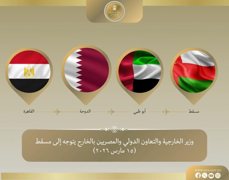 توجه د. بدر عبد العاطي وزير الخارجية والتعاون الدولي والمصريين بالخارج، مساء الأحد ١٥ مارس، إلى العاصمة العُمانية مسقط، في ثالث محطات جولته لعدد من الدول العربية الشقيقة، لنقل رسالة تضامن كاملة مع سلطنة عُمان الشقيقة في ظل الظرف الإقليمي الراهن.