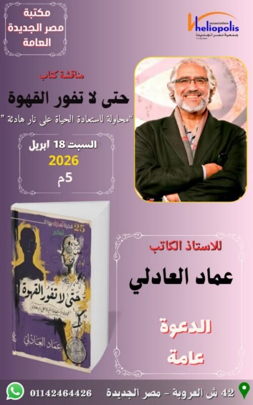حفل توقيع ومناقشة كتاب حتى لا تفور القهوة لعماد العادلى في الساعة السادسة من مساء غد السبت فى مكتبة مصر الجديدة.