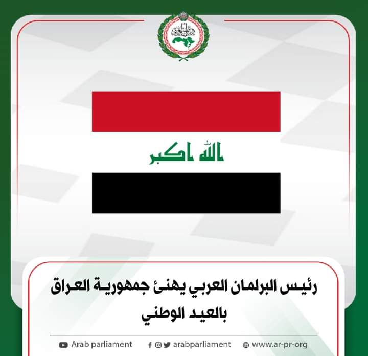 هنأ عادل بن عبدالرحمن العسومي رئيس البرلمان العربي، جمهورية العراق رئيسا وحكومة وبرلمانا وشعبا بمناسبة ذكرى العيد الوطني الذي يتم الاحتفال به في الثالث من أكتوبر من كل عام.