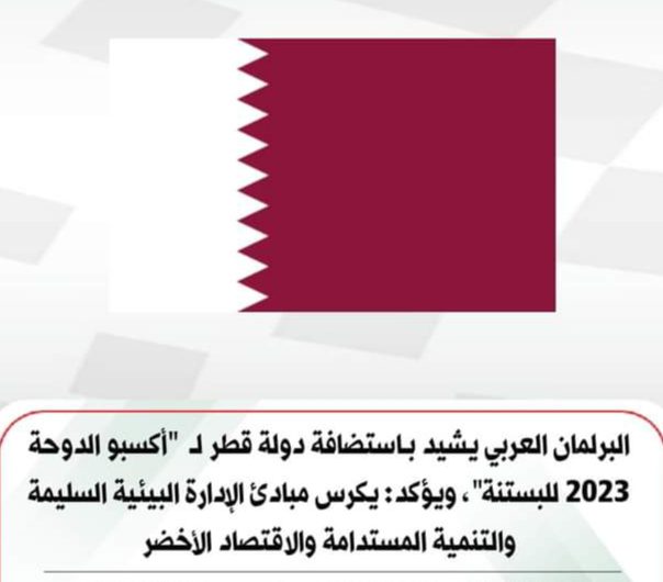 وأكد البرلمان العربي أن استضافة دولة قطر لهذا المعرض الهام الذي يقام للمرة الأولى في المنطقة، يعكس حرص دولة قطر بقيادة الأمير تميم بن حمد آل ثاني أمير دولة قطر، على تكريس مبادئ الإدارة البيئية السليمة والتنمية المستدامة والاقتصاد الأخضر، والتي تتماشى مع النهج العالمي الحالي لمواجهة آثار ظاهرة التغير المناخي والوصول إلى بيئة عالمية آمنة ومستدامة.