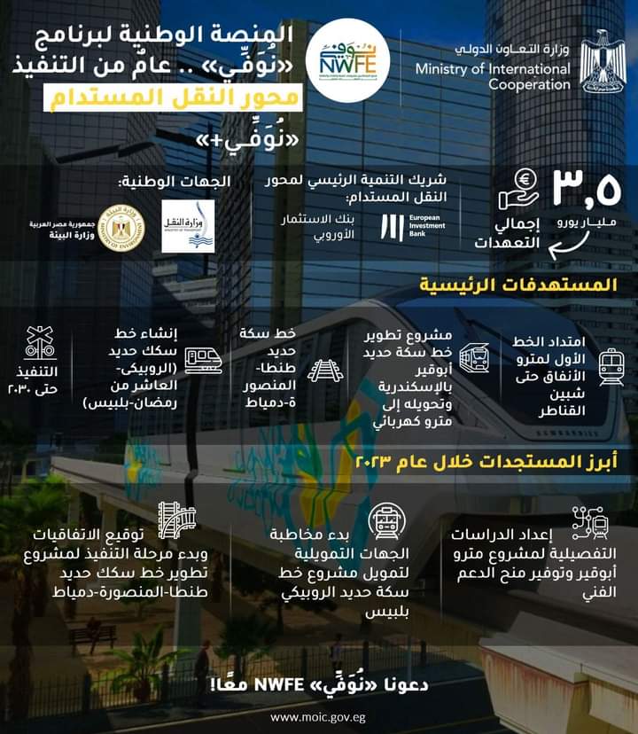 وزارة التعاون الدولي: تعهدات مالية من البنك الأوروبي لإعادة الإعمار والتنمية وبنك الاستثمار الأوروبي والوكالة الفرنسية لتنفيذ مشروعات النقل المستدام ضمن برنامج «نُوَفِّــي+»